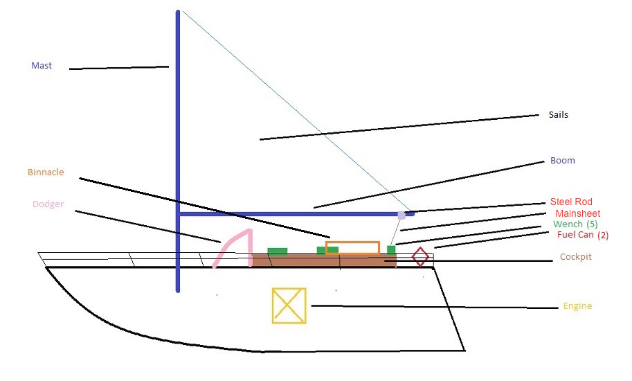 This first day on the water was the toughest of our trip. We almost died (but actually). Reference the wireframes and understand the location of the following words: boom, boom vang, binnacle, cockpit, wench, jackline.