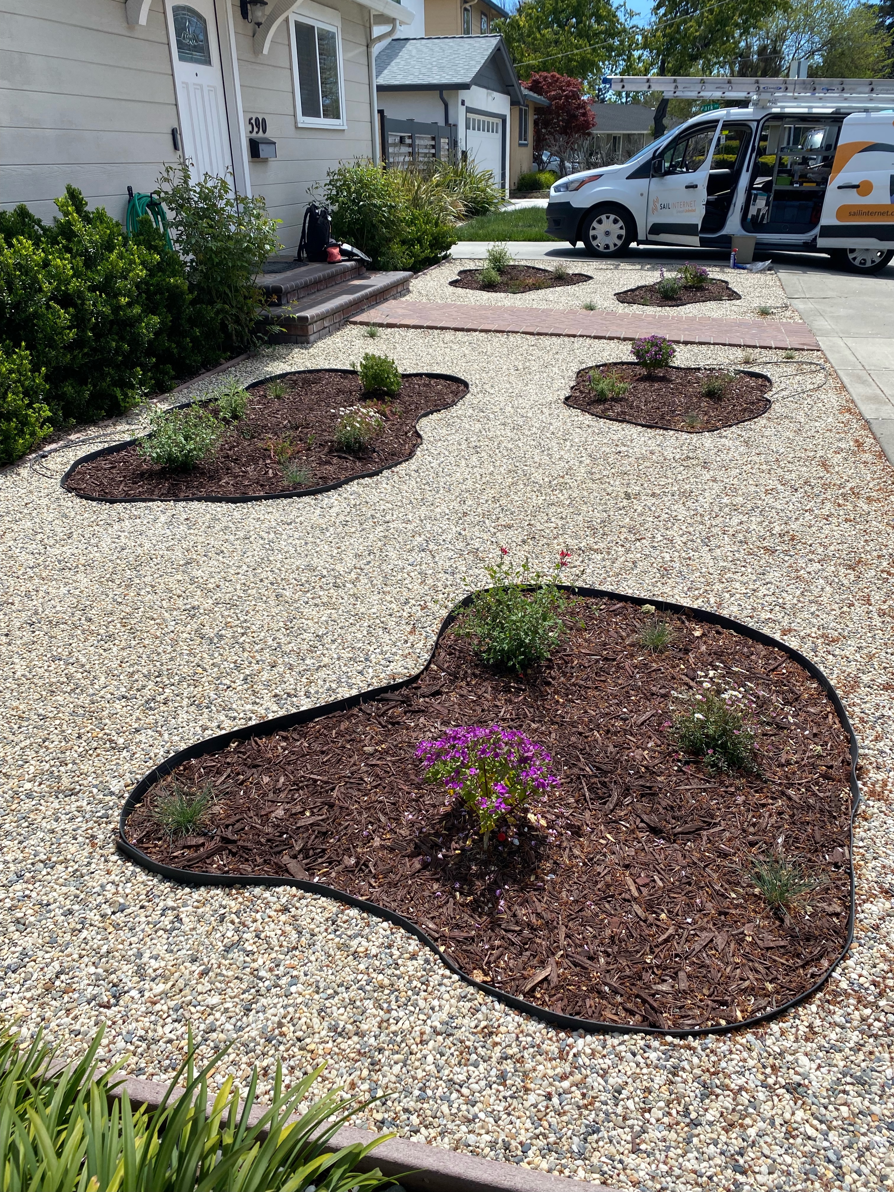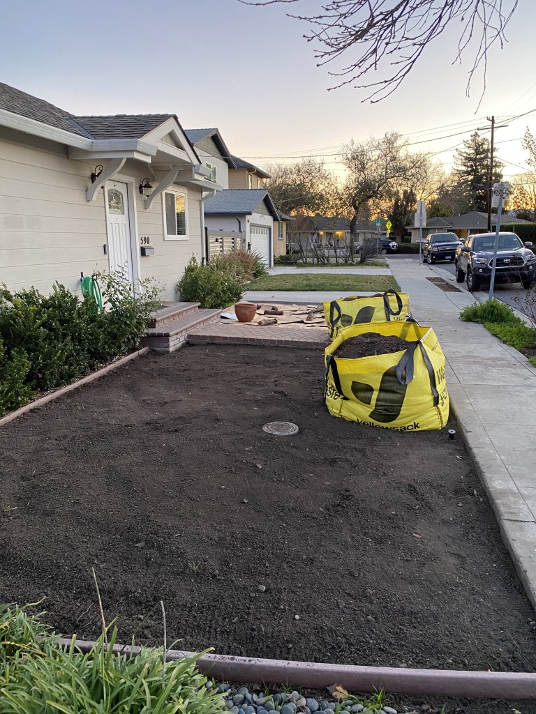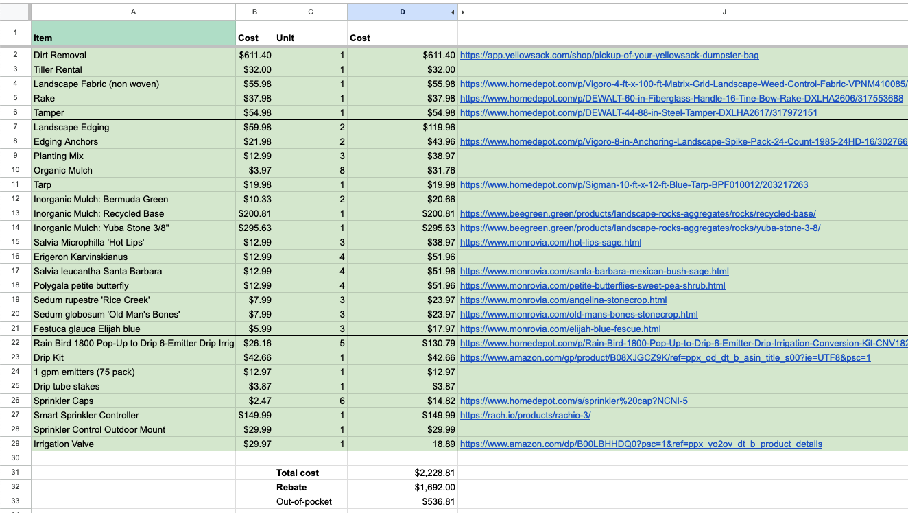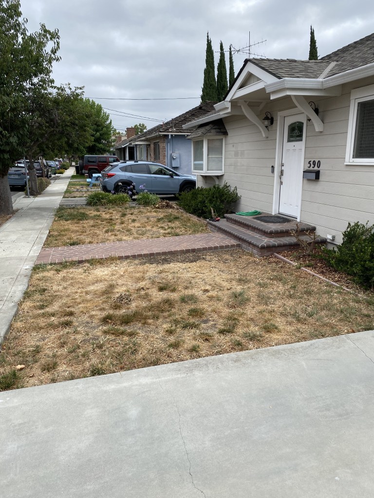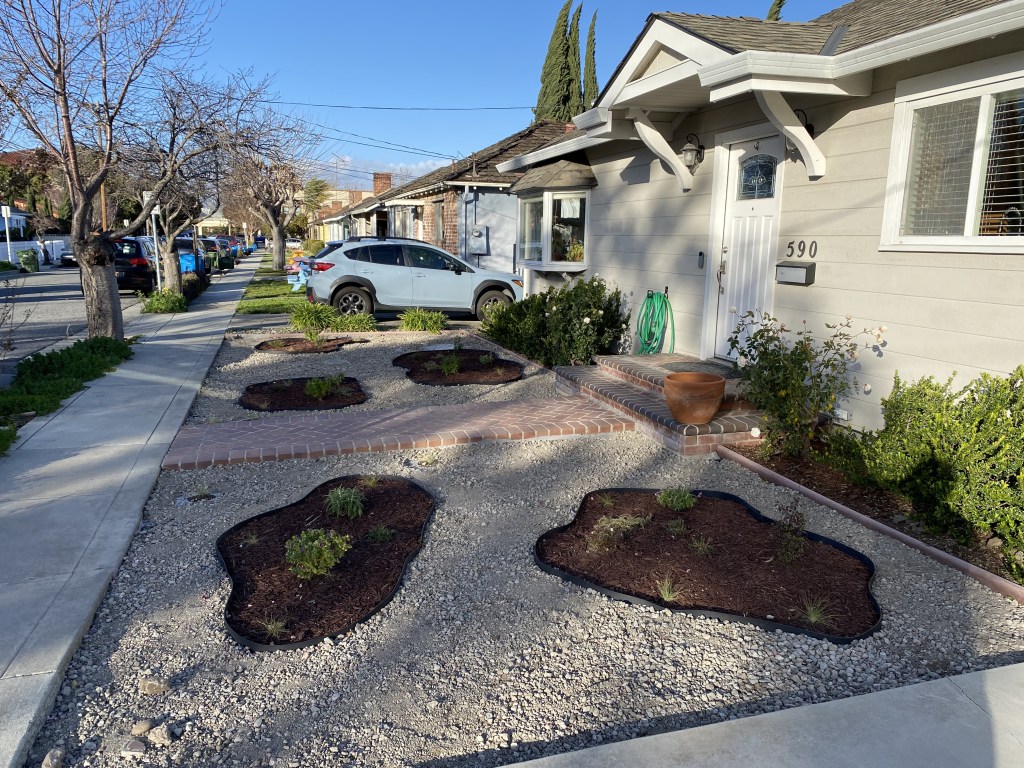 I learned about a government rebate program offered to a bunch of Silicon Valley cities. The program pays homeowners to replace their grass with drought tolerant plants. The requirements were pretty simple: plants at their mature size must comprise 50% or more of the converted area, and everything else can be organic mulch like tree bark or inorganic mulch such as rocks. The rebate program is managed by Valley Water, and we were given $4 per square foot converted. A surveyor measured our lawn at 423 square feet, so we were eligible for a $1,692 rebate.