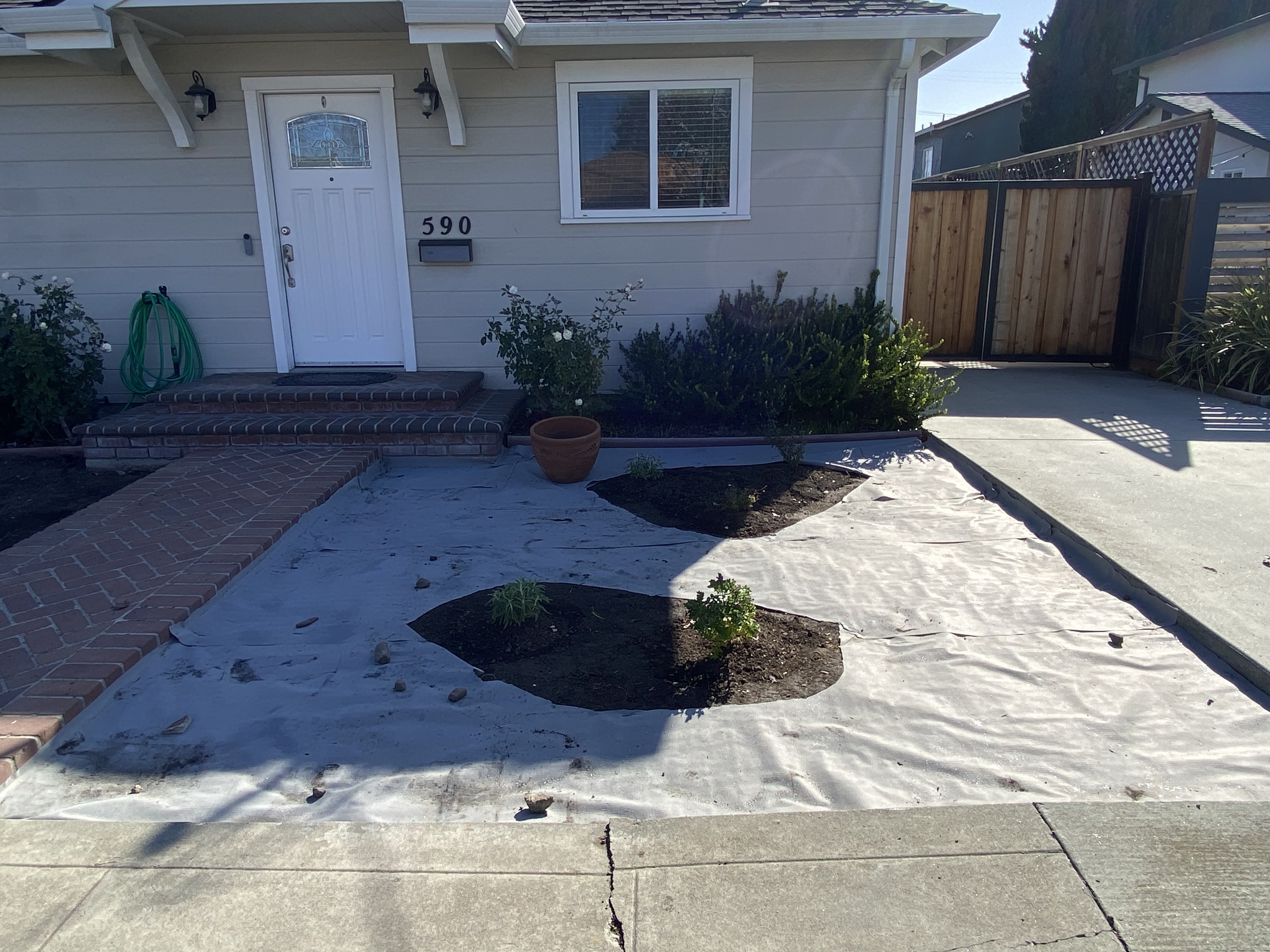 - Planting some plants before putting down all the landscape fabric. Had to get creative with placing fabric around existing plants.