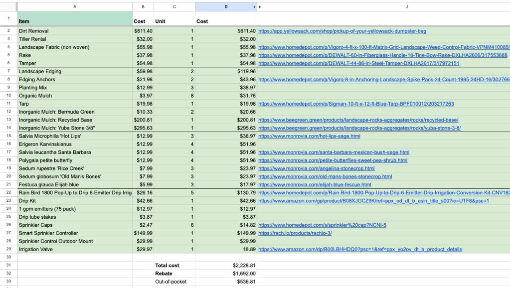 I was already tired of looking at our ugly dead lawn, and the rebate was enough to motivate me to finally take action. I wanted to do everything ourselves to keep costs low while using the opportunity to learn about landscaping, gardening, and irrigation.