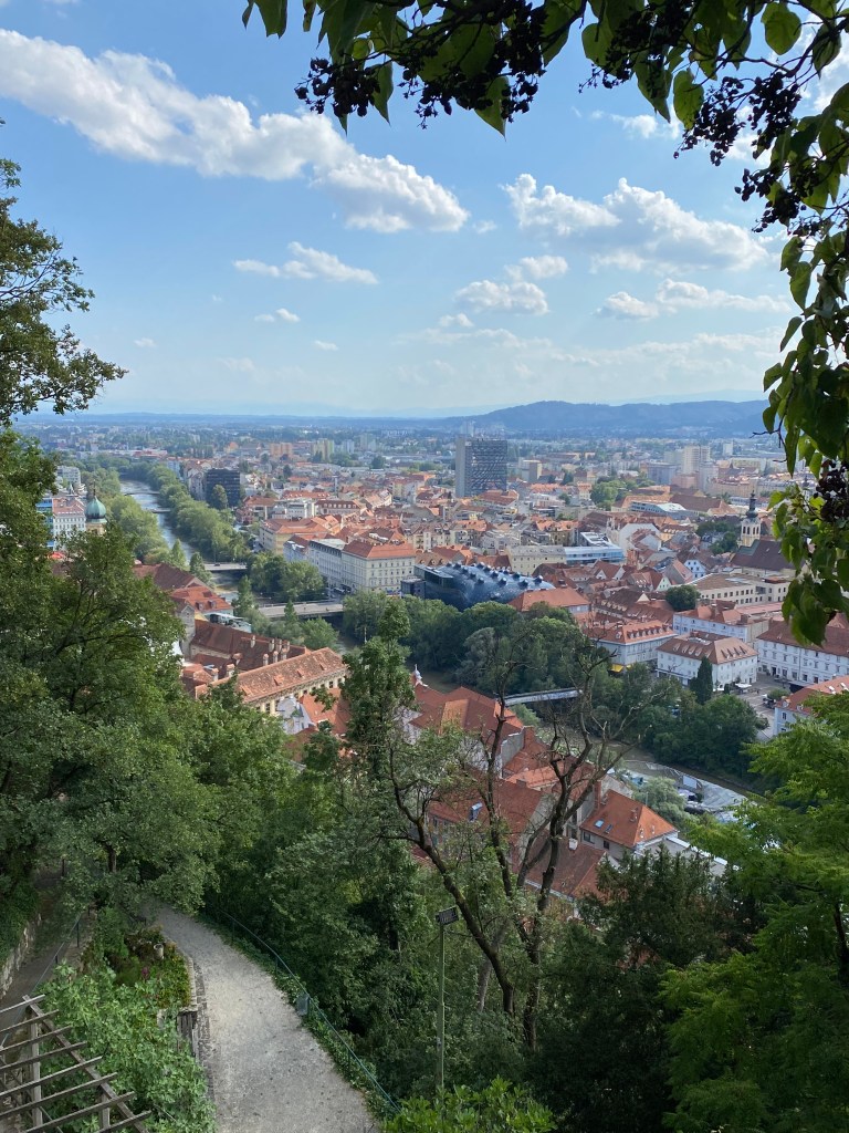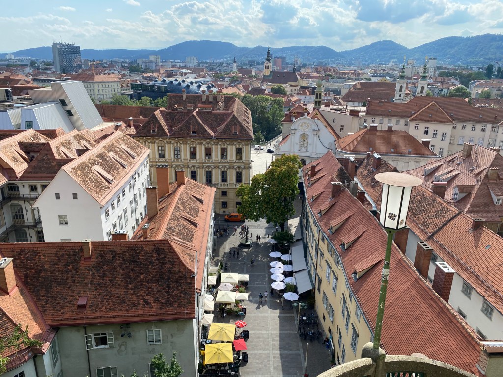 There’s a 13th century clocktower up on the hill called Uhrturm. Graz looks like Durnstein, but on a much bigger scale.