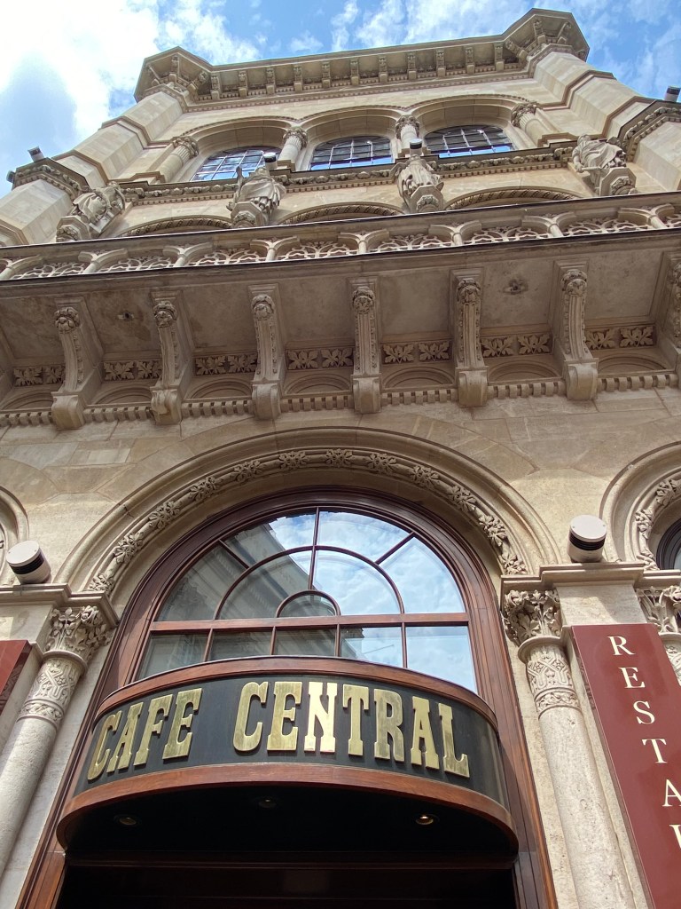 Next stop: Cafe Central. We walked by St. Stephen’s Cathedral en route. The side of the cathedral was going through some repairs, and I very much appreciated the giant “STOP WAR” banner in Ukrainian blue and yellow colors hanging on the side.