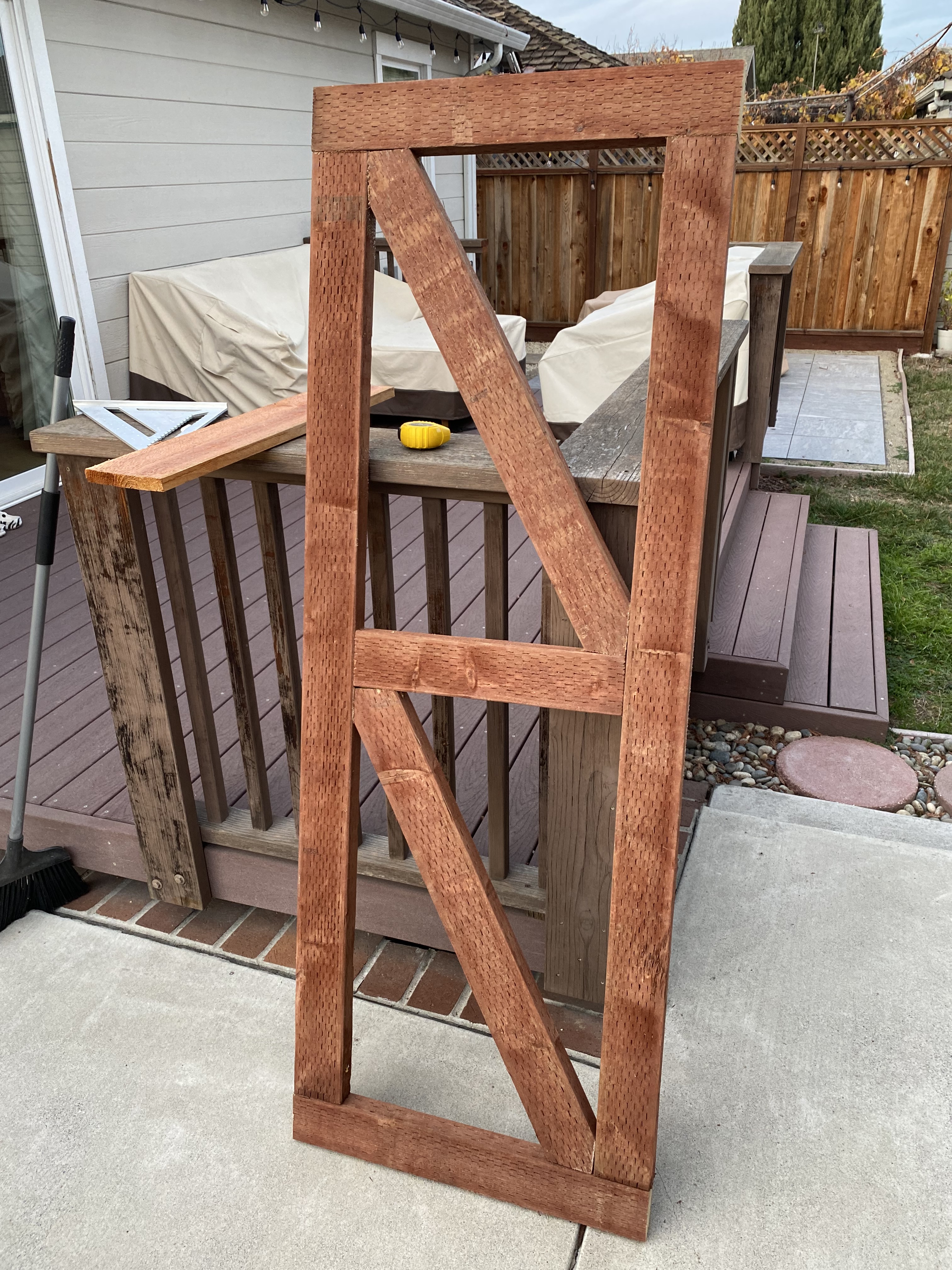 I screwed the hardware onto the frame, then screwed the frame onto the fence post to double check that it would fit. I left a 0.75″ gap between the fence post and the frame to allow the gate to swing freely. I chose stainless steel hardware rather than galvanized steel for longevity against corrosion and rust.