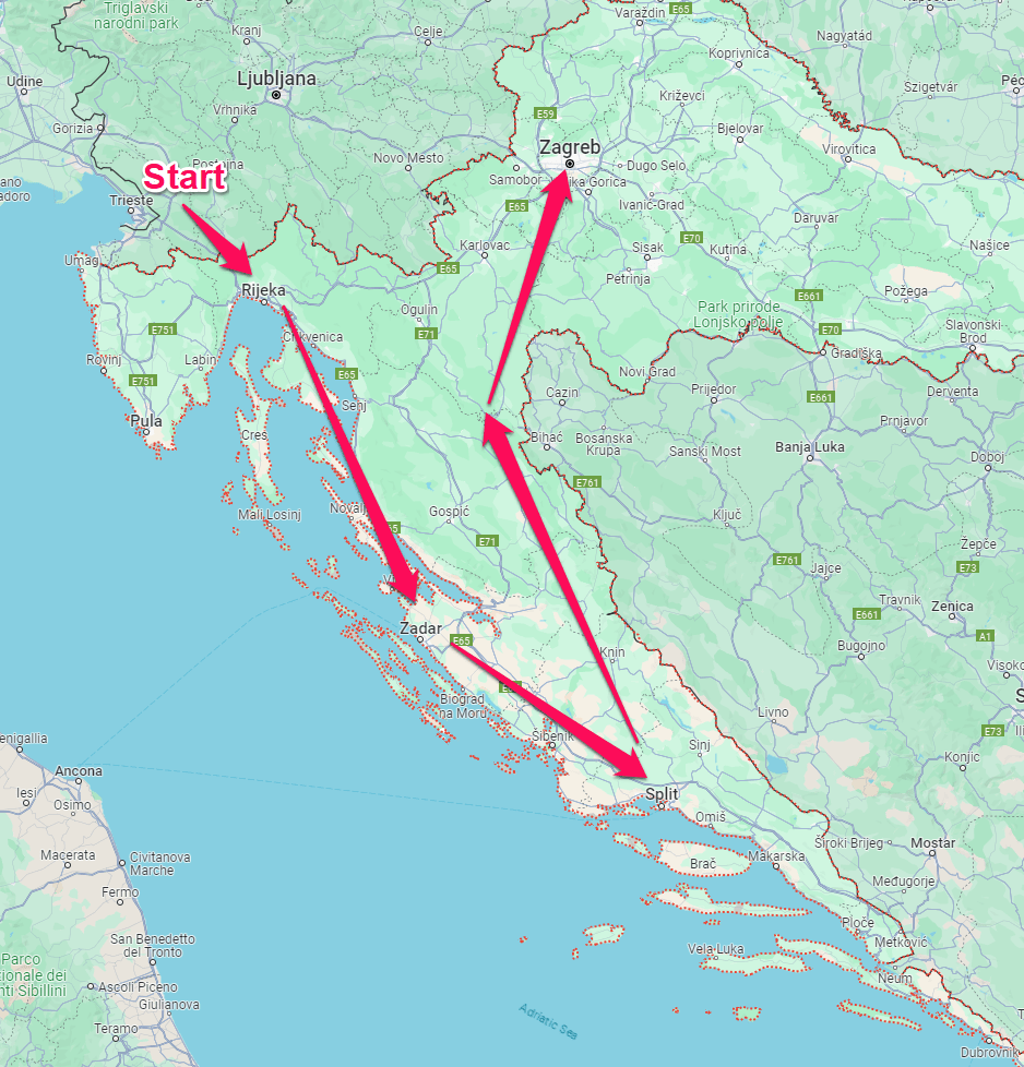 We entered Croatia through Slovenia to the north. The goal was to gradually make our way south, reaching Split, and turning back north to Zagreb.