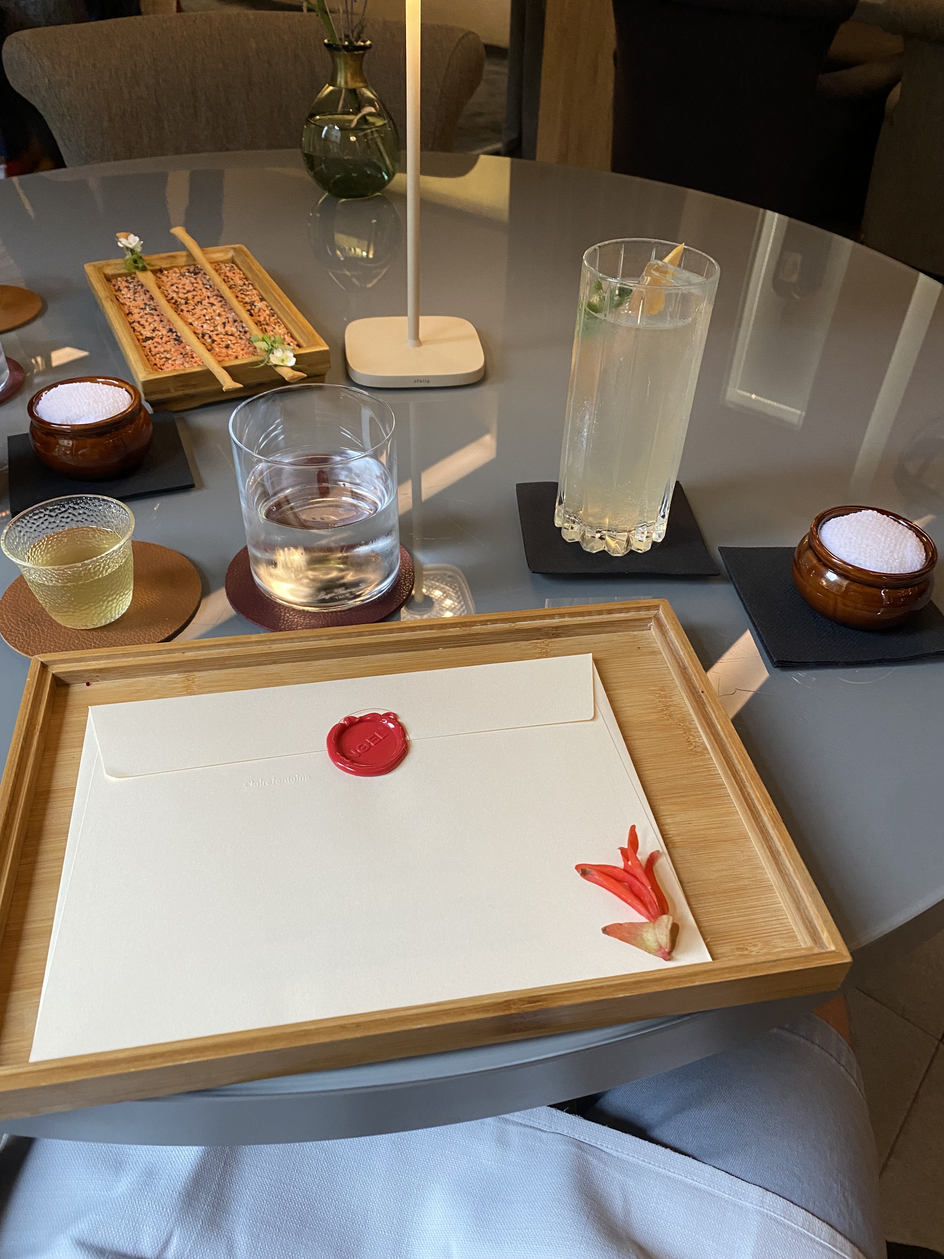 We first sat down in a lobby where a waiter took our drink order. After a few minutes of sipping on our drinks, we were then led to our table. A stamped envelope was on the table for each of us to open, and it contained the menu.