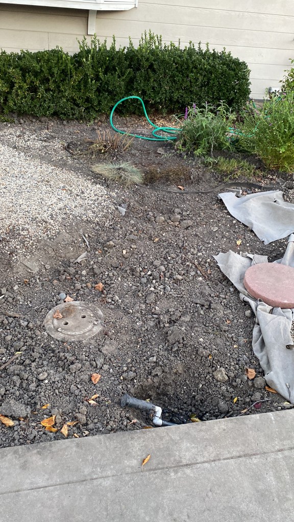 Unfortunately, in order to connect the water and sewage lines to the ADU, the general contractors dug through everything we worked on. Here’s what things looked like by the time the contractors finished plumbing and had backfilled the dirt.