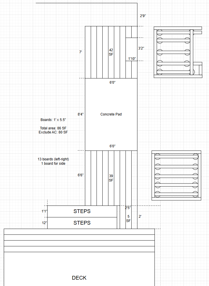 Per usual, I took measurements, designed a simple layout, planned how the deck joists would be built, and calculated material quantities.