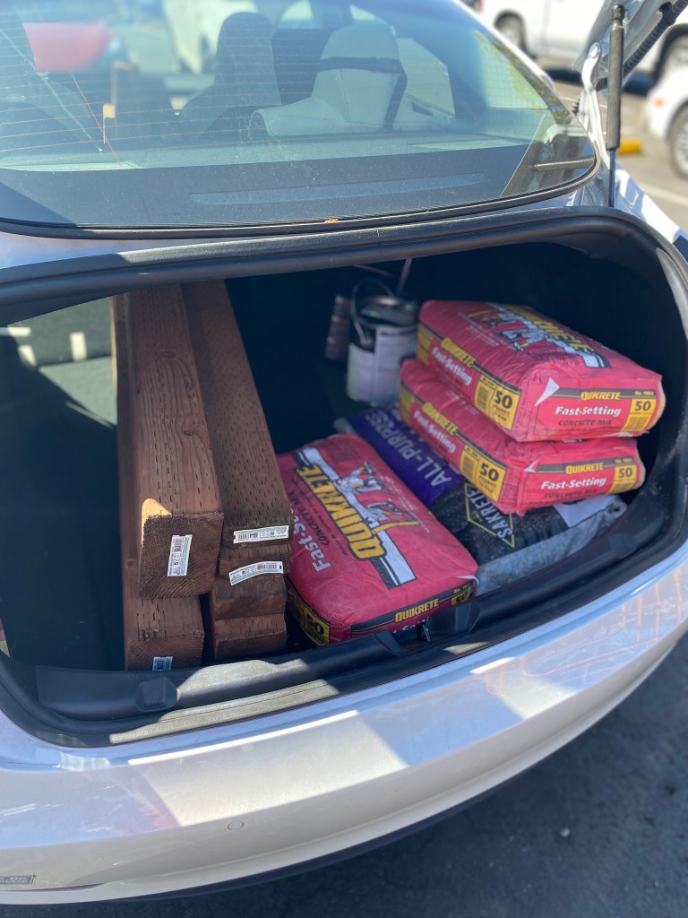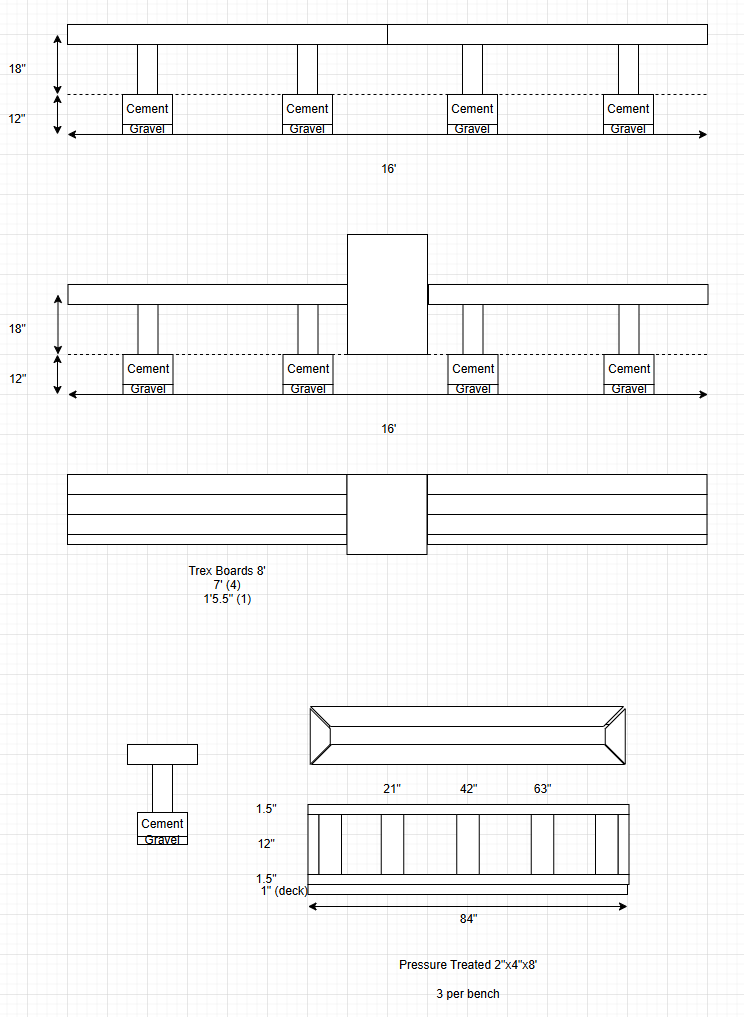 Next, I measured exactly where to dig holes to put the bench legs into. I had designed the benches to sit on two legs rather than four. Digging 12-13″ was fairly easy, but the benches were incredibly heavy and difficult to move. I had fully assembled them together since I didn’t know how else to ensure the benches would be level in the ground. I added gravel to the bottom of each hole, deadlifted the benches in, leveled them, and poured the concrete in. Benches done!