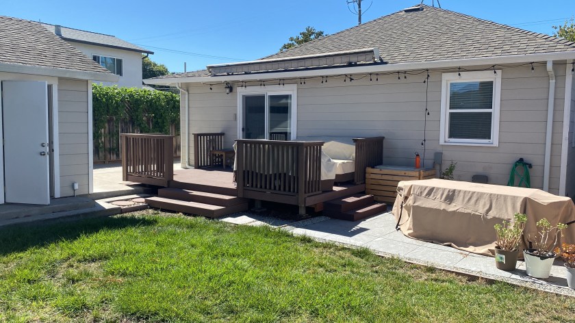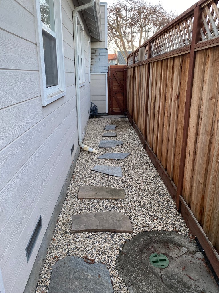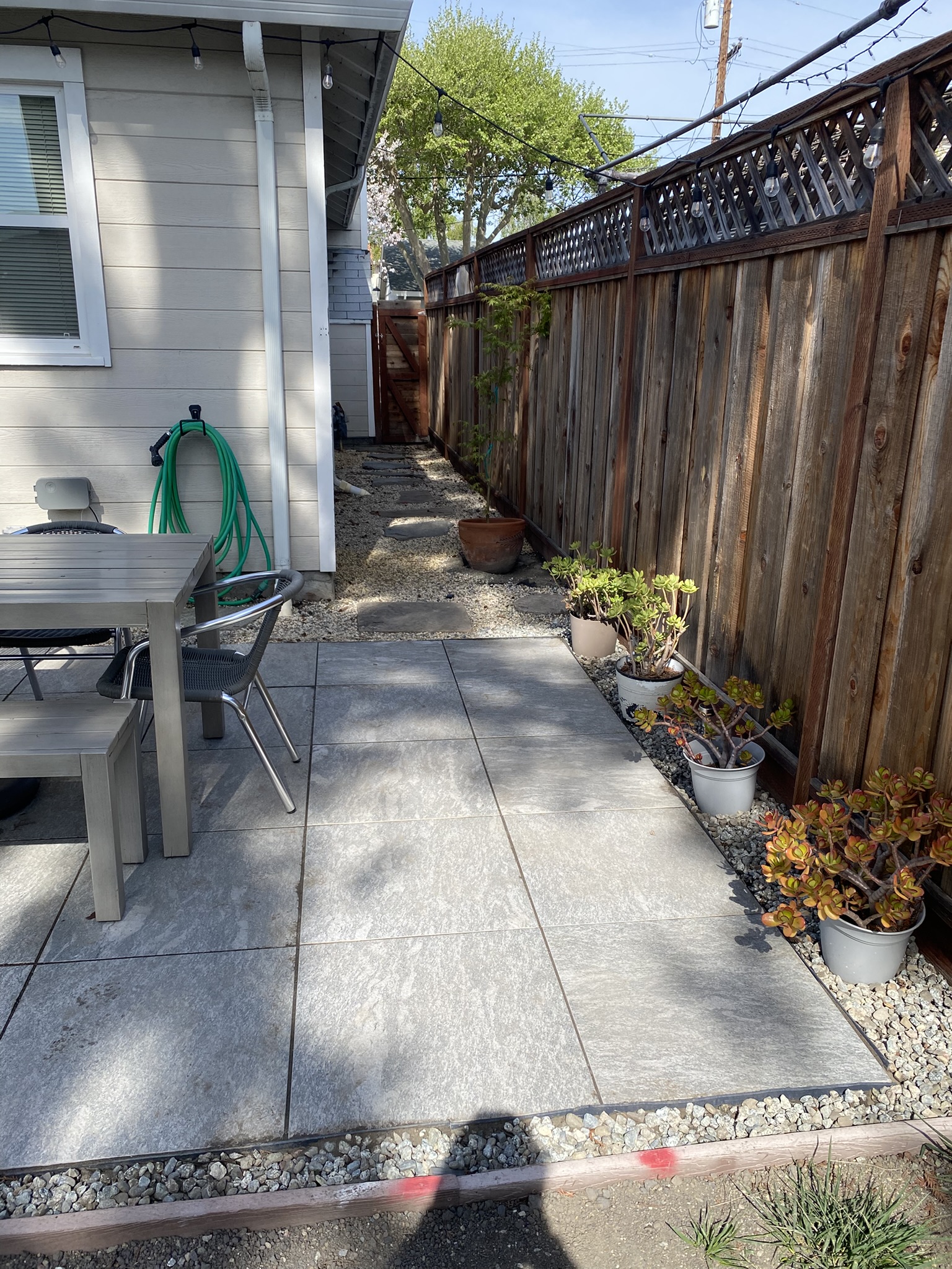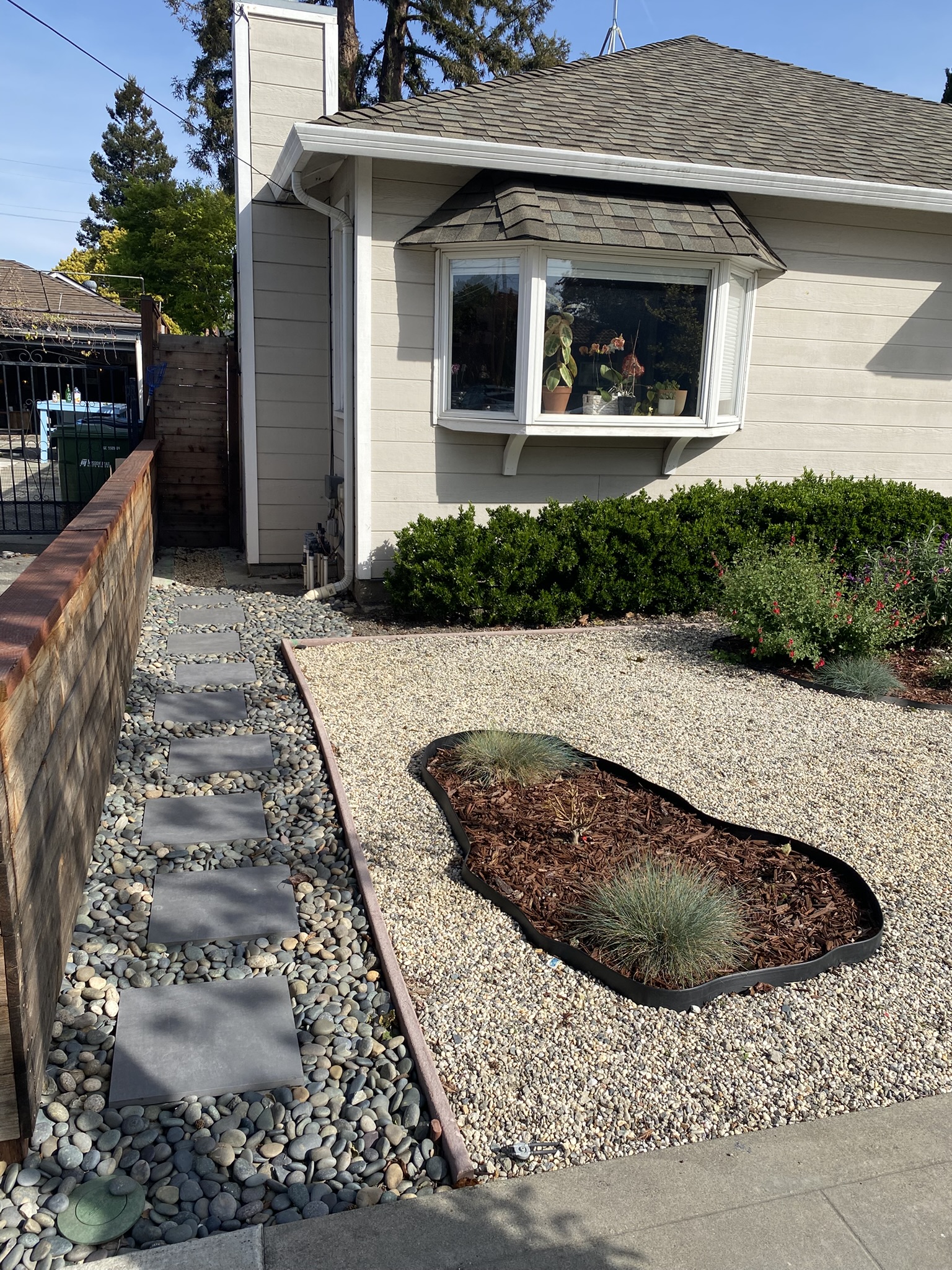 In 2022 and 2023, we converted the front yard lawn into drought tolerant landscaping, built a side entrance to the backyard, and built a patio in the backyard.