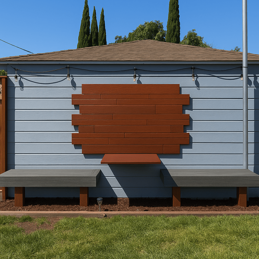 We enjoyed the benches for some time as we tried to figure out how to build the table in between. We eventually committed to a retractable table against an accent wall that was part décor, part dart board for entertainment. I used AI to render some visuals for inspiration.