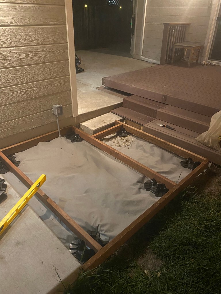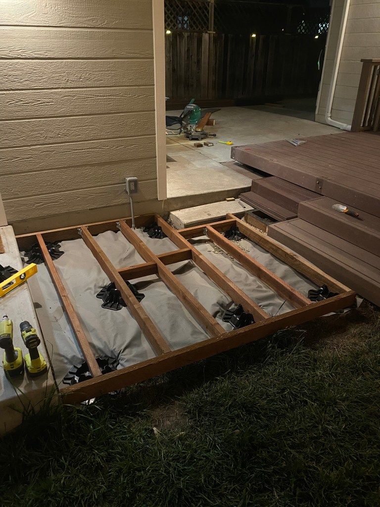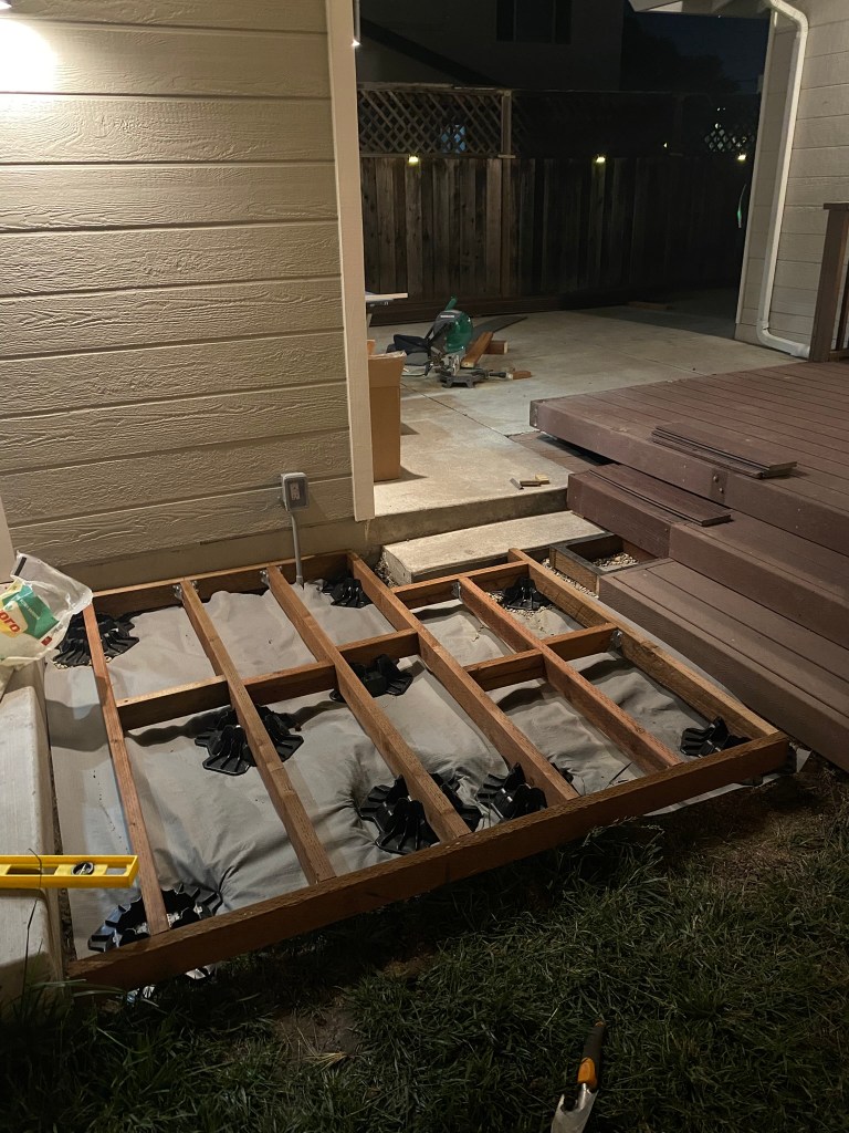 The concrete step also made it harder than expected to construct the frame. I settled on two rectangular frames that were interconnected. Once that was in place, adding and reinforcing the joists was super fun and straight forward.