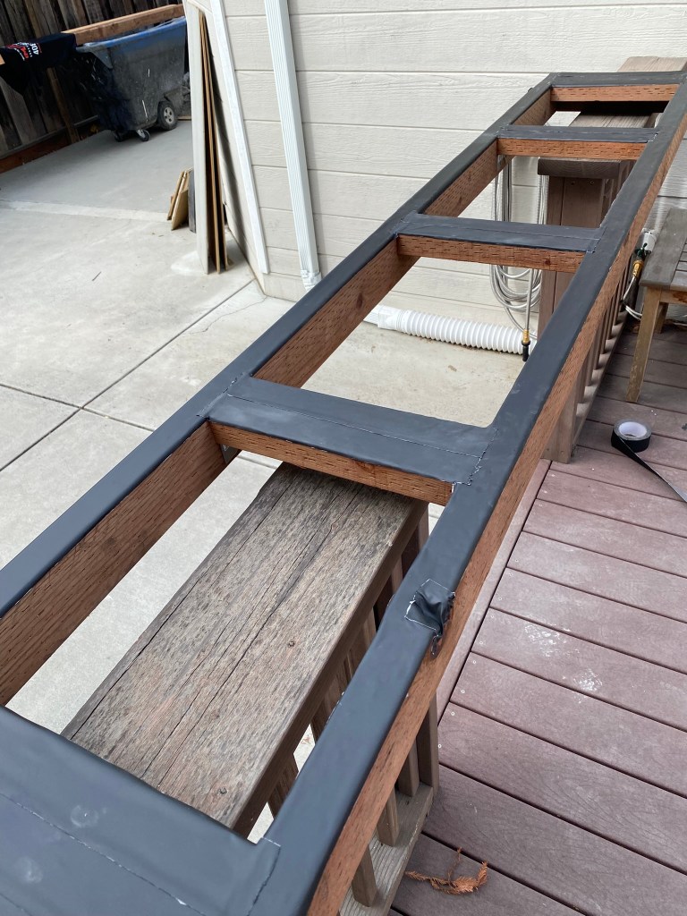 What was way more fun was building the benches. Having already built deck steps before, I had a good understanding of the process. I also bought a used miter saw from Facebook Marketplace for $50 to simplify cutting. Within a couple working sessions, the decks were pretty much built, including steel plate reinforcements throughout the frame.