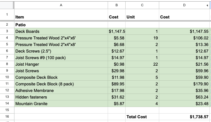 Per usual, the deck boards were by far the largest expense. My greatest surprise was seeing that the screws cost >$150. I assumed it would be cheap.